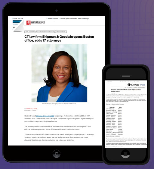 Shipman & Goodwin required a strategic communications partner to elevate its brand visibility, position attorneys as industry leaders, and support firm-wide growth initiatives in a highly competitive legal marketplace. The firm needed consistent, high-impact media exposure and clear messaging that reinforced its client-first culture while supporting talent recruitment, retention, and geographic expansion.